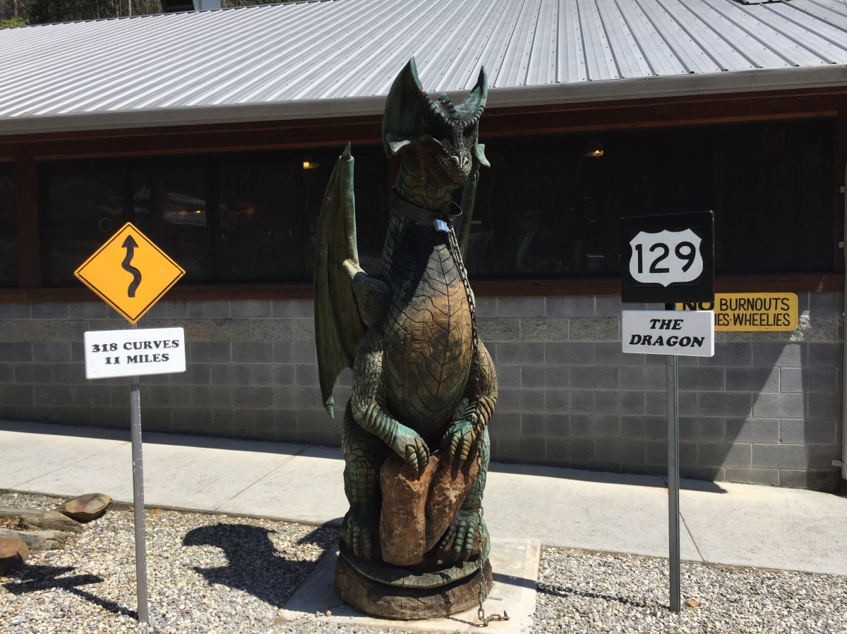 I did the “Tail of the Dragon”, “The Dragon”, “Deal’s Gap”, seems to have multiple names.  This is a ride that most bikers know about and dream of doing!  The Dragon is located in the middle of Route 129.  It’s 318 curves in 11 miles long.  It’s pretty intense, but extremely fun to do.  Some say I started from the end, I came in from Asheville and just before I started it there were a couple of stores with souvenirs and a restaurant.  I stopped and looked around and then ate lunch.  The owners of the restaurant race bikes on the side, and serve a great lunch.  I chatted with them and some other folks that had just come through.